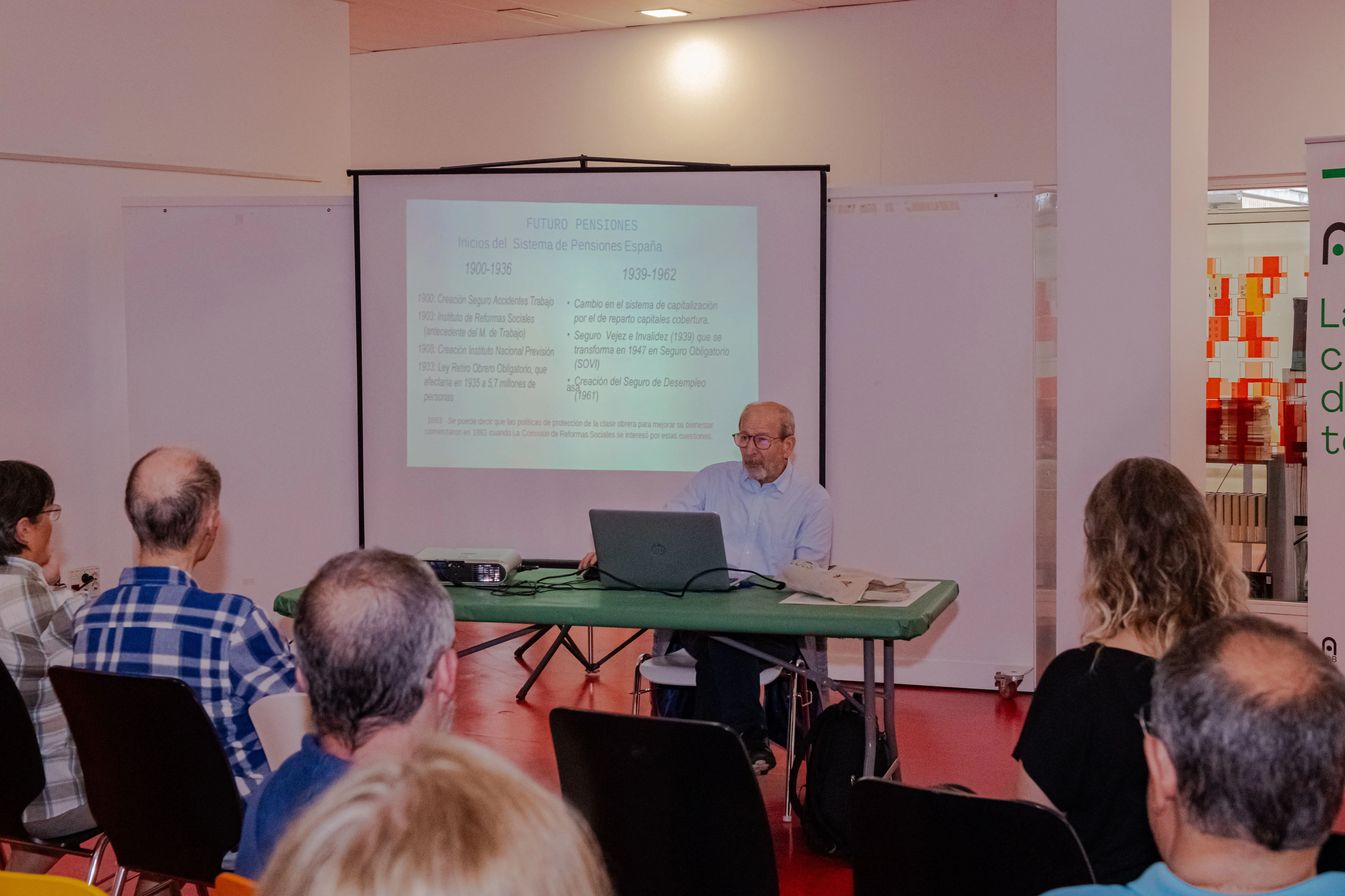 Després de fer una retrospectiva per la història i antecedents del sistema de pensions establert durant el s. XX, Marcos va fer una breu explicació de com es fa el càlcul de les pensions, reflexionant sobre com factors com l'augment de l'esperança de vida o el descens de la natalitat van en detriment d'un sistema de pensions fixes i indefinides que esdevé molt poc sostenible i deficitari. És per això que a l'inici del segle XXI es prenen diverses mesures, com el canvi del càlcul de la base reguladora o endarreriment de l'edat de jubilació.